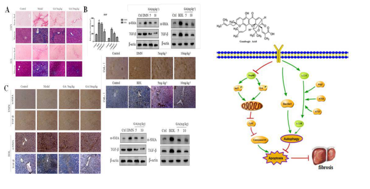 抗肝纤维化等保肝活性筛选(细胞和动物)发表时间:2020-08-06 14:44 ü 肝纤维化体内实验:建立化学损伤性动物肝纤维化模型。给予大鼠口服给药,直至造模结束。检测了大鼠血清中谷草转氨酶(AST)、谷丙转氨酶(ALT)的水平;取大鼠肝组织进行病理切片,通过HE染色观察大鼠肝脏病理变化,通过Sirius Red和Masson 染色观察大鼠肝脏胶原纤维的变化,并且测定与胶原合成有关的羟脯氨酸的含量;采用Real-time PCR、免疫组织化学、Western blot方法检测了肝纤维化相关因子α-SMA、TGF-β及与胶原合成和降解相关的COL- I、TIMP-1、MMP-2的表达;在分子机制的研究中,采用Western blot方法考察化合物对PI3K/Akt、MAPK信号通路相关蛋白的影响。 ü 抗肝纤维化体外实验:采用MTT法检测不同浓度药物处理大鼠肝星状细胞T6和人肝星状细胞LX2后的细胞活力,同时也检测了相同浓度下化合物对L02(人正常肝组织细胞)活力的影响;流式细胞仪检测药物处理后细胞周期的变化,并通过Annexin-V/PI双荧光染色标记法检测T6和LX2的凋亡率;采用透射电镜观察T6和LX2的形态改变;Western blot 分析了α-SMA的表达水平,cyclin-D1、Cdk-4细胞周期蛋白和凋亡相关蛋白以及Bcl-2、Bax,caspase-3,caspase-9和 PARP表达,在分子机制研究中,考察了PI3K/Akt、MAPK通路中相关信号分子变化;以不同浓度药物和抑制剂,同时干预HSC-T6和LX2两种细胞,比较药物与这两种抑制剂对上述信号途径的作用。 Ø 研究实例: