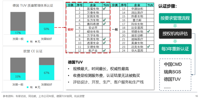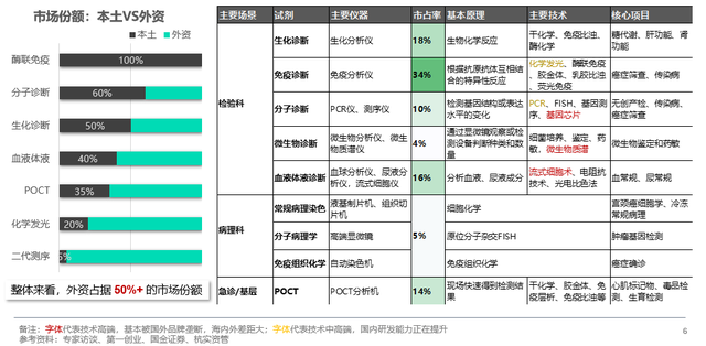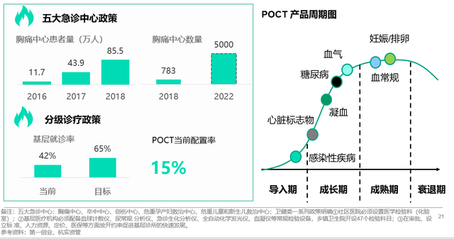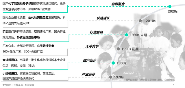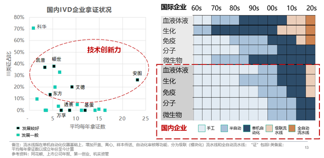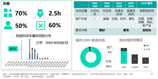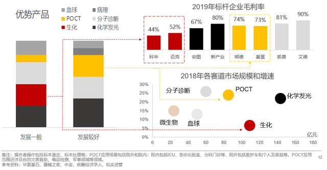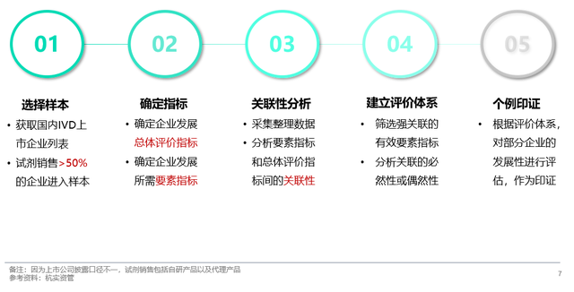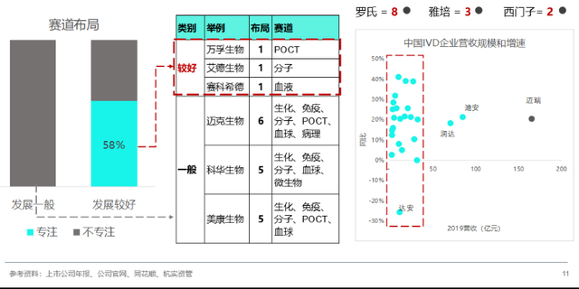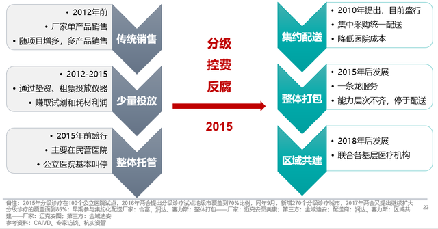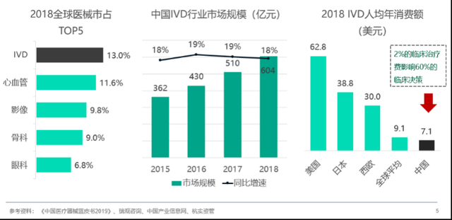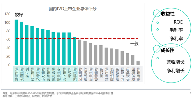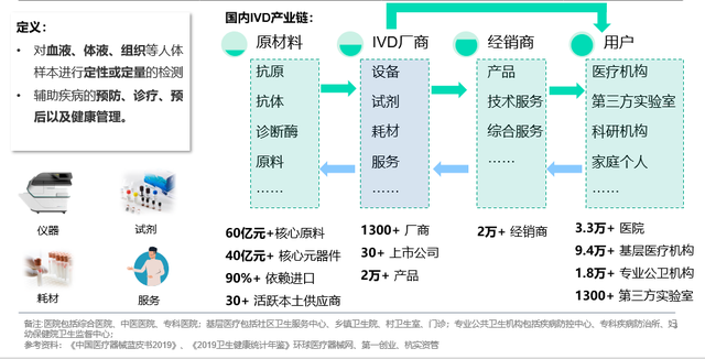 透视IVD行业:典型样本、发展规律与行业趋势发表时间:2018-02-12 09:36 编辑:顿雨婷 摘要:本文由上市公司样本研究和行业趋势研究两块构成。上市公司样本研究发现,产品专注度、优势产品、产品创新力、销售区域、销售费用、质量管理体系是评价企业发展的关键指标。行业趋势研究发现:自动化流水线、POCT、分子诊断外包是产品技术的发展方向;分级诊疗、医保控费、医疗反腐推动商业模式集约化升级;另外,收并购将成为IVD行业的常态。 一、 研究背景 1.1体外诊断(IVD)概念和产业链 广义上,体外诊断(IVD)是指对人体样本(血液、体液、组织)进行定性或定量的检测,用来辅助疾病的预防、诊疗、预后和健康管理。狭义上,指体外诊断产品和体外诊断服务,前者包括仪器、试剂和耗材。 国内IVD产业链由三部分构成。 上游是原材料,包括试剂中的抗原、抗体、诊断酶等,以及仪器相关元器件。由于原材料直接影响检测成果,对稳定性要求高,我国90%的原材料依赖进口。 中游是IVD厂商——本文主要研究对象,输出仪器、试剂、服务。在我国,海外五大巨头占据50%的市场,而国产厂家整体呈现小而散的竞争格局。1300多家IVD厂家中,大多是小型试剂企业,同时具备试剂和仪器研发能力的企业凤毛麟角。 下游是经销商和用户:行业内有2万多个经销商,不仅为终端用户提供产品,还输出技术支持;终端用户主要有医疗机构、第三方实验室、科研机构、家庭个人等。其中,医疗机构是主要用户。我国有3.3万家医院、9.4万所基层医疗机构、1.8万所专业公卫机构。 ![]() 图表 1 体外诊断(IVD)概念和产业链 1.2 行业发展简史 IVD行业在我国经历了六个阶段: 第一阶段是70年代产业萌芽——国内小规模进口,实验室自制试剂,管理混乱;第二阶段是80年代国产起步——大规模进口,出现第一批生化、免疫领域的本土企业,包括迈瑞、安图、科华;第三阶段是90年代初期无序竞争——厂家众多,大部分不具备资质,充斥恶行竞争;第四阶段是90年代末期行业整顿——药监部进行市场清理,取缔违规厂家,外资品牌此时已垄断市场;第五阶段是10年代快速成长,国内企业实现部分技术追赶,尤其是生化和酶联免疫,科华和达安率先进入IPO;目前,行业进入了创新整合的新阶段,国产化学发光和分子诊断逐步实现进口替代,更多企业登录资本市场,在长三角、珠三角、京津冀形成IVD产业集群。 ![]() 图表 2 行业发展简史 1.3 行业总体特征 1.3.1 特征一:市场大、发展快、有成长潜力 IVD行业市场大、发展快、有成长潜力。它是全球医疗器械最大的细分市场。2018年以13%的市占率排名第一,高于心血管(11.6%)、影像(9.8%)和骨科(9%)。 2018年中国IVD行业的市场规模达到604亿元,并且每年以18%-19%的速度稳步快速增长。 和发达国家相比,中国的IVD人均年消费额只有7美元,接近美国的1/9、日本的1/6、西欧的1/4——具有上升空间。究其原因,供给端方面,我国IVD产业起步晚,技术落后,检测标的物种类和检测方法数量和国外差距大——美国和日本能提供的检测项目超过5000种,而中国目前只有2000种。 需求端方面, 群众意识不强,比如肺癌的检查,不少国外患者在早期就会被发现并治疗,而在中国,大多患者发现时已是晚期。另外,国内还有很多项目没有进医保,商业保险覆盖面也不足,很大程度影响IVD项目消费。 ![]() 图表 3行业总体特征一:市场大、发展快、有成长潜力 1.3.2 特征二:细分领域众多,中、高端基本被外资垄断 IVD行业细分领域众多,中、高端基本被外资垄断。 医院检验科囊括了IVD行业81%的应用场景。根据技术精度要求的从低到高,可以分为生化、免疫和分子诊断。 生化诊断是基于糖类、脂类等生物大分子水平的检测。以18%的市占率排名第二,核心项目包括糖代谢、肝功能和肾功能。它是中国IVD企业最早突破的领域,国产率达50%,已是竞争红海。由于技术门槛相对较低,国内同质化竞争明显。 免疫诊断是基于抗原抗体水平的检测。市占率最高,达34%,主要包括癌症筛查和传染病检测。其中酶联免疫基本实现国产,但这种方法正在被更先进的化学发光所淘汰。化学发光的国产率只有20%,技术壁垒较高,仪器以封闭设计为主,外资形成垄断。国内,新产业是这一领域的龙头。 分子诊断是基于基因水平的检测。市占率达10%,主要包括无创产检、传染病和癌症筛查。虽然分子诊断在我国起步较晚,仪器研发和国外差距巨大——二代测序的国产率只有5%。但试剂和服务具有明显优势。代表公司有艾德生物、华大基因。 此外,血液体液诊断主要指血常规和尿常规;微生物诊断主要指微生物鉴定和药敏。 病理科是IVD行业第二类应用场景,不过国内发展不成熟,市占率只有5%。安必平是唯一上市公司,专注病理诊断产品的研发和服务。 急诊和基层是第三类应用场景,POCT 是最合适的产品。POCT 指在现场采样,即刻出结果的方法。它可以横跨多个技术平台,使用多种检测方法。血糖仪、验孕棒就是例子。该领域竞争激烈,技术难度不同,国产率不同,综合来看,国产率在35%左右。 ![]() 图表 4 行业总体特征二:细分领域众多,中、高端基本被外资垄断 1.4 研究途径 IVD上市公司样本研究分为五个步骤: 第一步,选择样本。从30多家国内IVD上市公司中,筛选出24家试剂销售收入占比大于50%的企业,作为样本;第二步,确定指标。一方面确定企业发展总体标价指标,另一方
