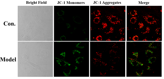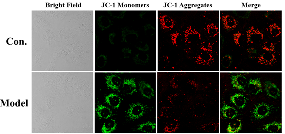 使用本试剂盒检测A549细胞在正常和造模前后的线粒体膜电位的效果图。正常A549细胞经JC-1染色后以聚合物形式存在,呈明亮的红色荧光,绿色荧光很弱;使用CCCP(10μM)诱导使线粒体膜电位下降后,JC-1以单体存在形式居多,因此线粒体内红色荧光强度显著降低,而绿色荧光显著增强。
